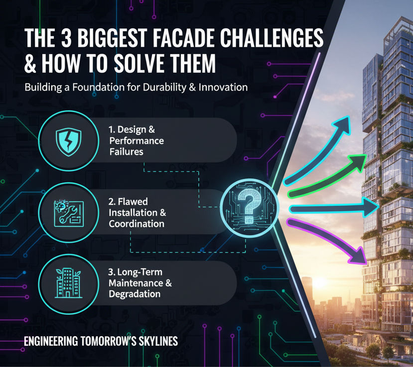 Address issues like weather damage, maintenance, thermal inefficiency, and design limitations, and provide solutions using advanced facade systems.